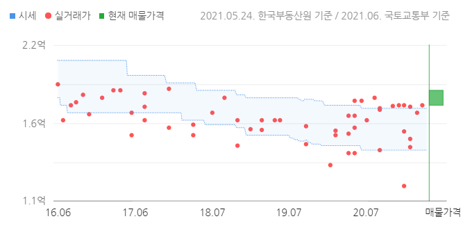 국토부 매매 실거래가는 2021년 5월 1억8000만원 7층, 2021년 4월 1억7500만원 등이 거래 되었습니다.