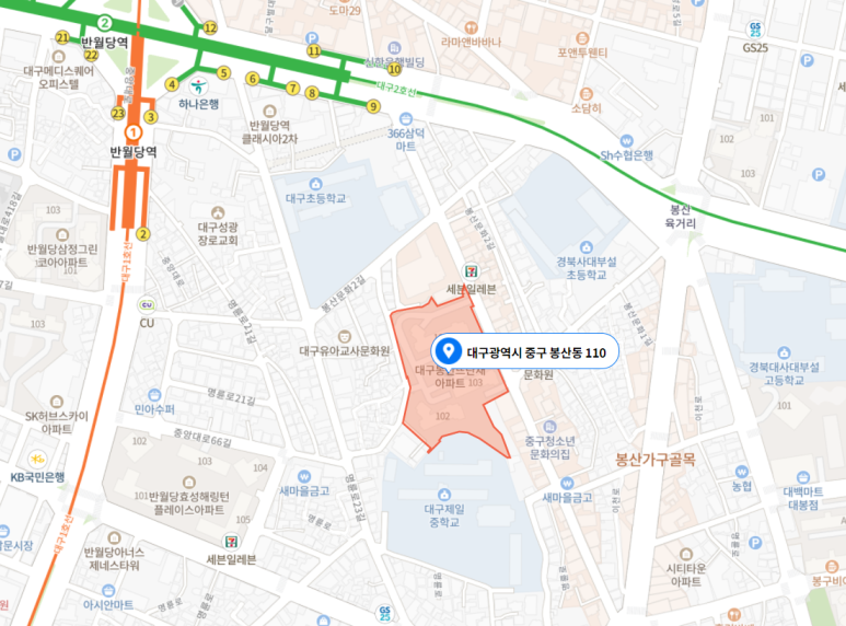 본 건까지 차량의 접그니 가능하며, 인근에 지하철1,2호선(반월당역) 및 시내버스승강 장이 소재하는 등 제반 교통사정은 무난함.