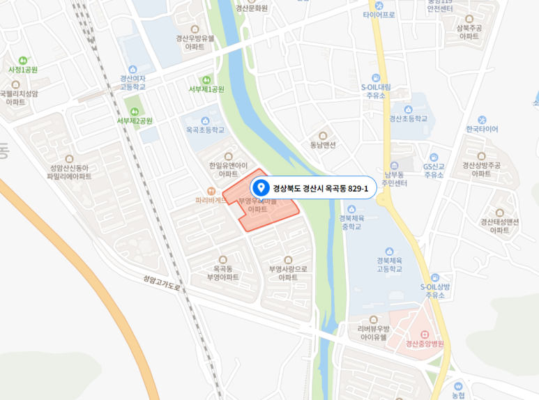 본건은 경상북도 경산시 옥곡동에 소재하는 "옥곡초등학교" 남동측 인근에 위치하며, 주위는 아파트단지, 근린생활시설 및 단독주택 등으로 형성되어 있음.